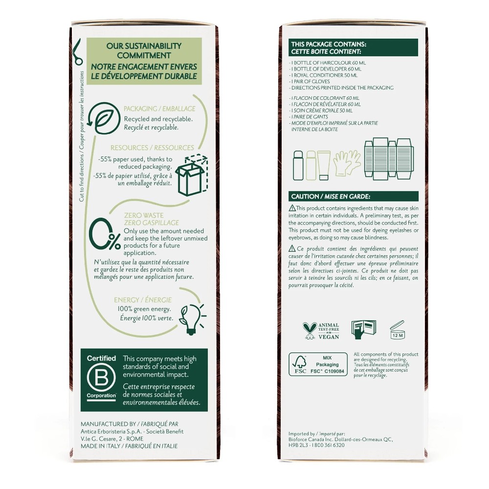 Haircolour gel Laureth-4, Propylene glycol, Aqua (Water), PEG-2 oleamine, Ethanolamine, Oleic acid, Aloe barbadensis (Aloe vera) leaf extract, Hamamelis virginiana (Witch hazel) leaf extract, Betula alba (Birch) leaf extract, Echinacea angustifolia (Echinacea) root extract, Juglans regia (Walnut) shell extract, Rheum palmatum (Rhubarb) root extract, Cinchona calisaya (Cinchona) bark extract, PEG-75 meadowfoam oil, Limnanthes alba (Meadowfoam) seed oil, p-Aminophenol, p-Methylaminophenol sulfate, p-Phenylenediamine, Tetrasodium EDTA, Cetrimonium chloride, Simethicone, Sodium metabisulfite, Glycerin. Developer aqua (water/eau), hydrogen peroxide, etidronic acid, trideceth-9, cetrimonium chloride, simethicone, propylene glycol, peg-40 hydrogenated castor oil. Royal cream aqua (water/eau), citric acid, cetyl alcohol, behentrimonium chloride, aloe barbadensis (aloe vera) leaf juice, moringa pterygosperma (moringa) seed extract, triticum vulgare (wheat/ble) germ oil, oryza sativa (rice/riz) bran oil, simmondsia chinensis (jojoba) seed oil, ppg-3 benzyl ether myristate, methyl gluceth-20, ethoxydiglycol oleate, isopropyl alcohol, sodium dehydroacetate, sodium benzoate, imidazolidinyl urea, tocopheryl acetate, glycerin, parfum (fragrance). natural origin & certified organically grown by: ecocert fr-bio-01-410229; icea 051bc-208/211/215/263; bioagricert cbnbac080858-cbn-04.
