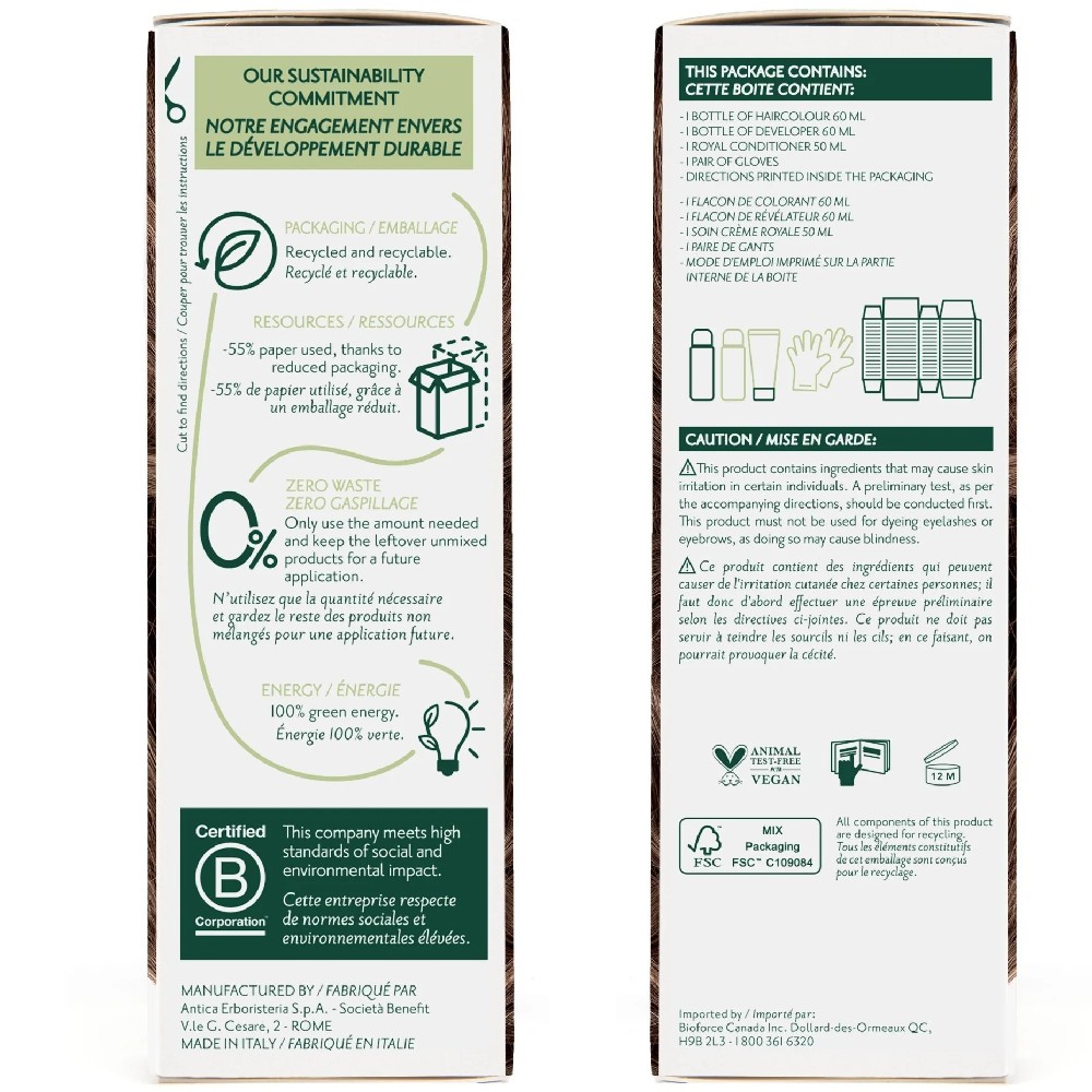 Haircolour gel Laureth-4, Propylene glycol, Aqua (Water), PEG-2 oleamine, Ethanolamine, Oleic acid, Aloe barbadensis (Aloe vera) leaf extract, Hamamelis virginiana (Witch hazel) leaf extract, Betula alba (Birch) leaf extract, Echinacea angustifolia (Echinacea) root extract, Juglans regia (Walnut) shell extract, Rheum palmatum (Rhubarb) root extract, Cinchona calisaya (Cinchona) bark extract, PEG-75 meadowfoam oil, Limnanthes alba (Meadowfoam) seed oil, p-Aminophenol, p-Methylaminophenol sulfate, p-Phenylenediamine, Tetrasodium EDTA, Cetrimonium chloride, Simethicone, Sodium metabisulfite, Glycerin. Developer aqua (water/eau), hydrogen peroxide, etidronic acid, trideceth-9, cetrimonium chloride, simethicone, propylene glycol, peg-40 hydrogenated castor oil. Royal cream aqua (water/eau), citric acid, cetyl alcohol, behentrimonium chloride, aloe barbadensis (aloe vera) leaf juice, moringa pterygosperma (moringa) seed extract, triticum vulgare (wheat/ble) germ oil, oryza sativa (rice/riz) bran oil, simmondsia chinensis (jojoba) seed oil, ppg-3 benzyl ether myristate, methyl gluceth-20, ethoxydiglycol oleate, isopropyl alcohol, sodium dehydroacetate, sodium benzoate, imidazolidinyl urea, tocopheryl acetate, glycerin, parfum (fragrance). natural origin & certified organically grown by: ecocert fr-bio-01-410229; icea 051bc-208/211/215/263; bioagricert cbnbac080858-cbn-04.