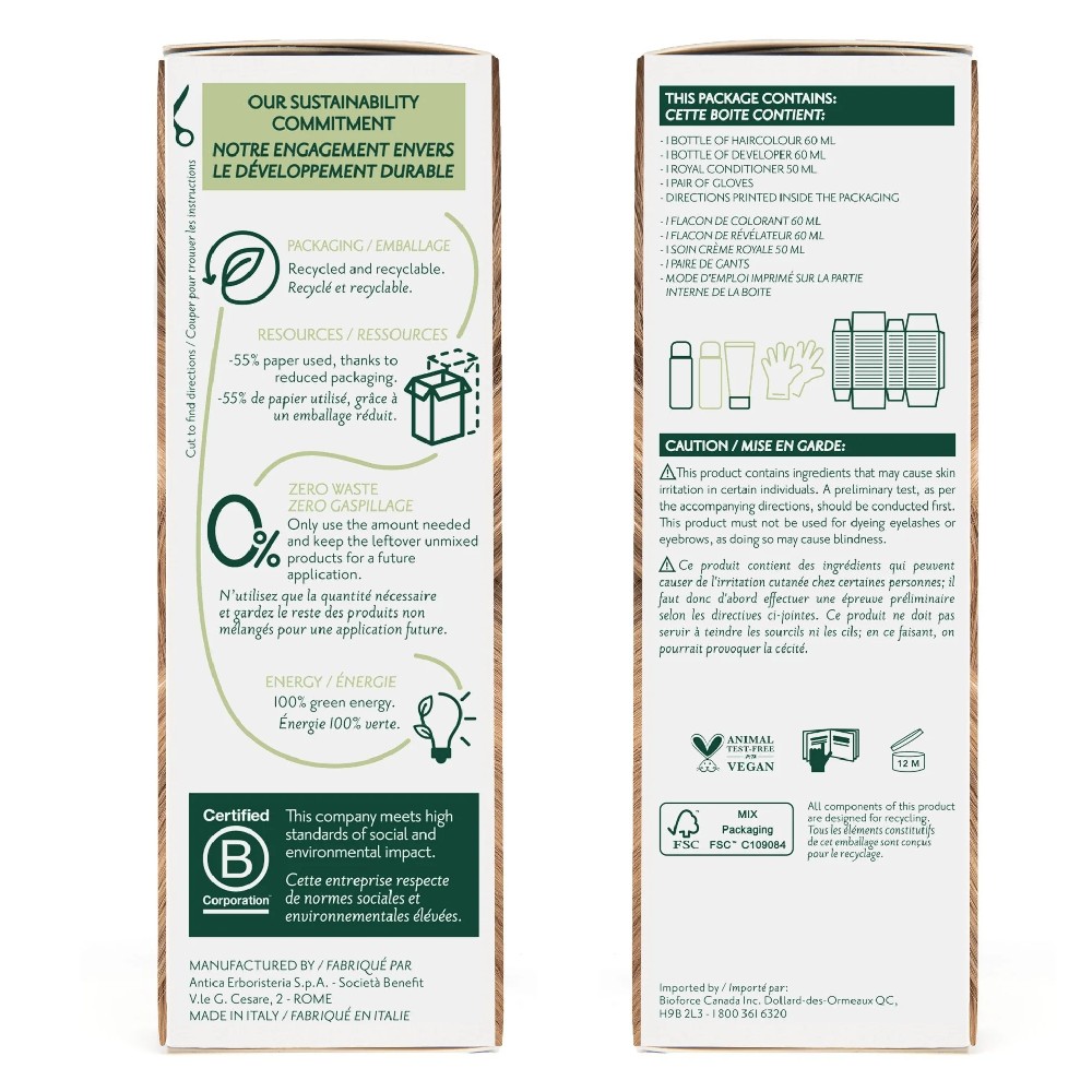 Haircolour gel Laureth-4, Propylene glycol, Aqua (Water), PEG-2 oleamine, Ethanolamine, Oleic acid, Aloe barbadensis (Aloe vera) leaf extract, Hamamelis virginiana (Witch hazel) leaf extract, Betula alba (Birch) leaf extract, Echinacea angustifolia (Echinacea) root extract, Juglans regia (Walnut) shell extract, Rheum palmatum (Rhubarb) root extract, Cinchona calisaya (Cinchona) bark extract, PEG-75 meadowfoam oil, Limnanthes alba (Meadowfoam) seed oil, p-Aminophenol, p-Methylaminophenol sulfate, p-Phenylenediamine, Tetrasodium EDTA, Cetrimonium chloride, Simethicone, Sodium metabisulfite, Glycerin. Developer aqua (water/eau), hydrogen peroxide, etidronic acid, trideceth-9, cetrimonium chloride, simethicone, propylene glycol, peg-40 hydrogenated castor oil. Royal cream aqua (water/eau), citric acid, cetyl alcohol, behentrimonium chloride, aloe barbadensis (aloe vera) leaf juice, moringa pterygosperma (moringa) seed extract, triticum vulgare (wheat/ble) germ oil, oryza sativa (rice/riz) bran oil, simmondsia chinensis (jojoba) seed oil, ppg-3 benzyl ether myristate, methyl gluceth-20, ethoxydiglycol oleate, isopropyl alcohol, sodium dehydroacetate, sodium benzoate, imidazolidinyl urea, tocopheryl acetate, glycerin, parfum (fragrance). natural origin & certified organically grown by: ecocert fr-bio-01-410229; icea 051bc-208/211/215/263; bioagricert cbnbac080858-cbn-04.