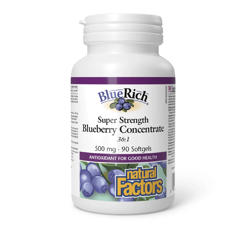 Blueberries support vision, slow premature aging, combat cognitive decline, and help prevent urinary tract infections, thanks to anthocyanins, the high ORAC (oxygen radical absorbance capacity) antioxidants in blueberries. Natural Factors BlueRich is a super strength 36:1 concentrate made from whole Canadian-grown blueberries, and provides the entire spectrum of blueberry nutrients.