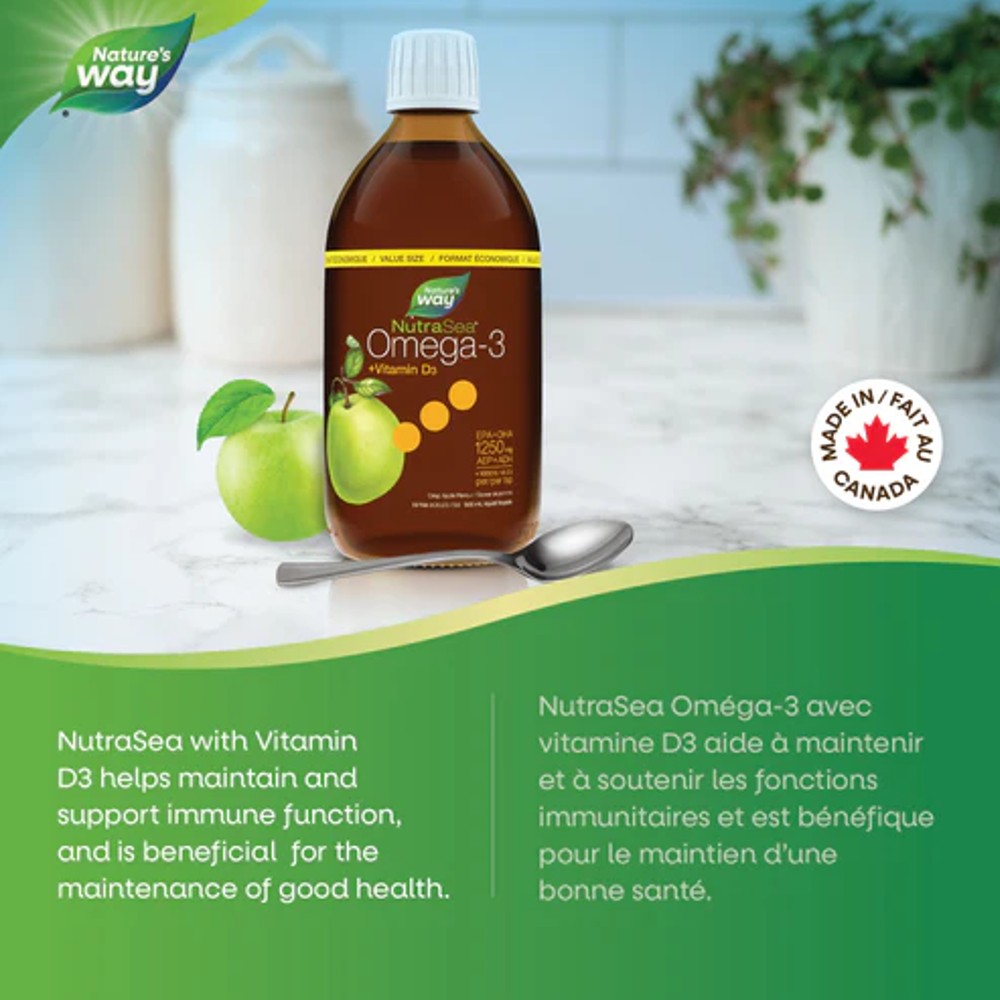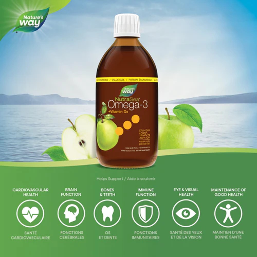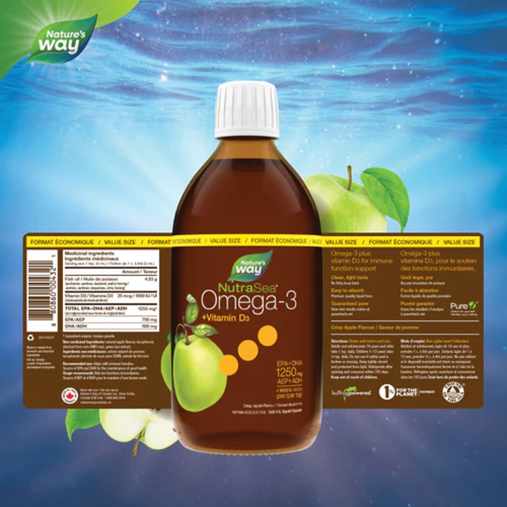 You’ll enjoy the clean, light taste of NutraSea+D premium quality liquid omega-3, in a delicious crisp apple flavour, with no fishy burp-back. With 1250 mg EPA+DHA + 1000 IU Vitamin D per dose, NutraSea+D is an easy way to get your omega-3 and vitamin D and is a great choice for anyone looking for a pure and balanced omega-3. NutraSea+D supports the maintenance of good health, cardiovascular health and cognitive & brain function. It also helps support the development of the brain, eyes and nerves in children and helps in the development and maintenance of bones and teeth.