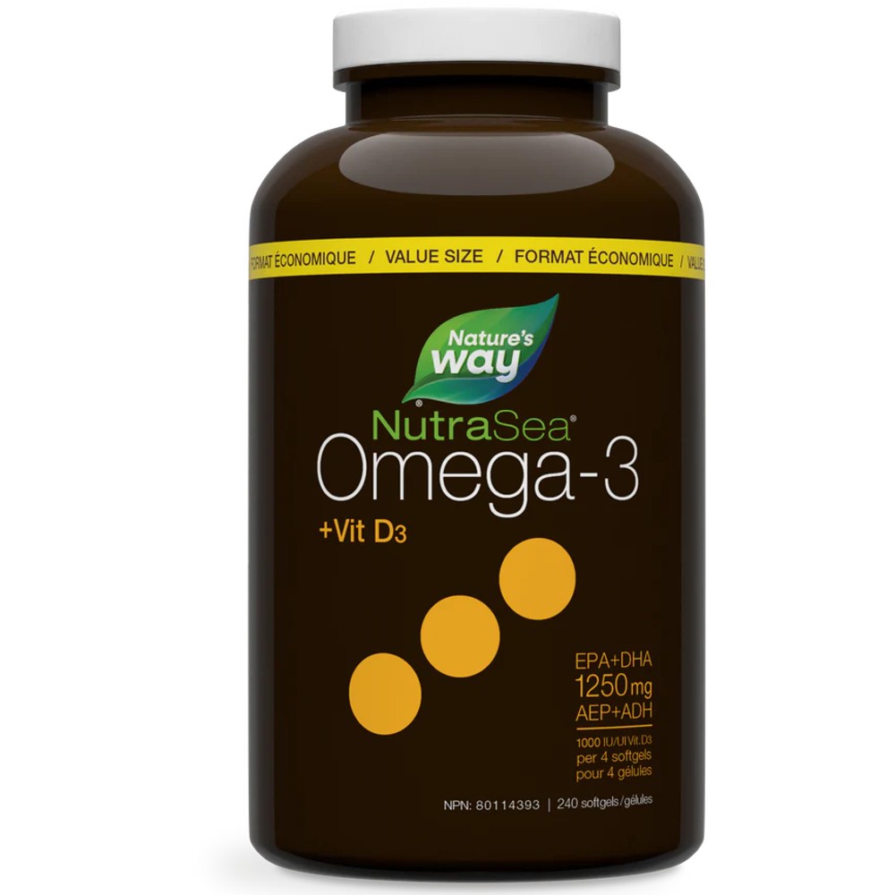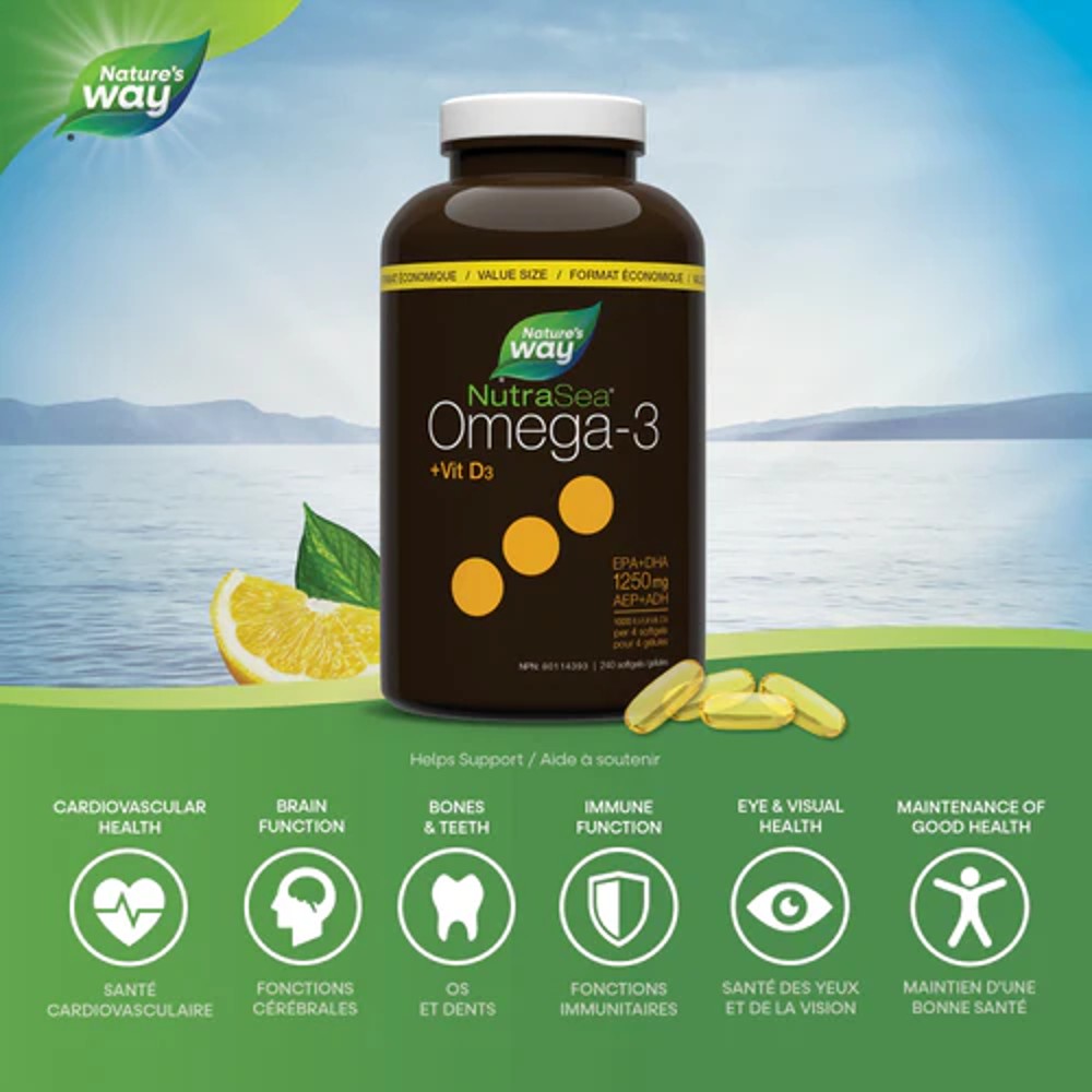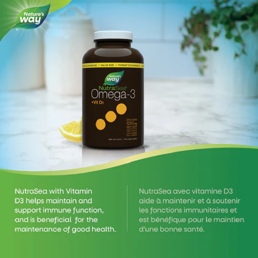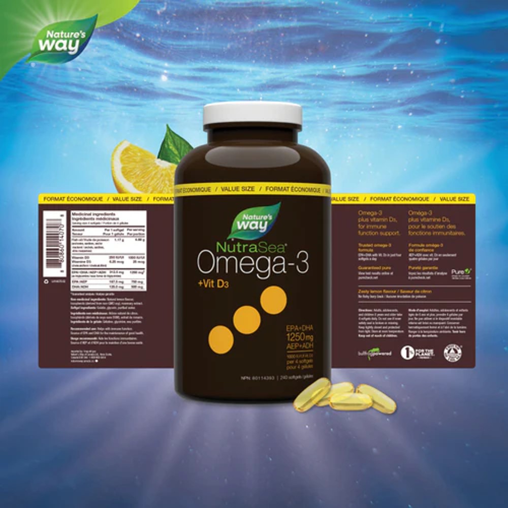 NutraSea+D premium quality omega-3 softgels have a fresh lemon flavour and no fishy burp-back. With a balanced ratio of 750 mg EPA and 500 mg DHA plus 1000 IU of vitamin D3 per serving of 4 softgels, NutraSea+D is an easy way to get your omega-3 and vitamin D3 and is a great choice for anyone looking for a pure and balanced omega-3. NutraSea+D helps to provide immune function support, and supports the maintenance of good health, cardiovascular health and brain function.