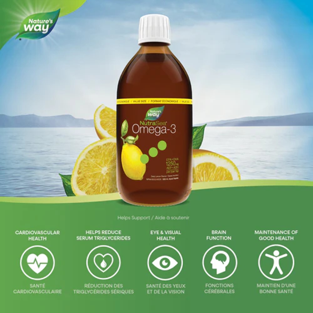 You’ll enjoy the clean, light taste of NutraSea premium quality liquid omega-3, in a delicious lemon flavour, with no fishy burp-back. With 1250 mg of EPA+DHA per serving, NutraSea is an easy way to get your omega-3 and is a great choice for anyone looking for a pure and balanced omega-3. NutraSea supports the maintenance of good health, cardiovascular health and cognitive & brain function . It also helps support the development of the brain, eyes and nerves in children.