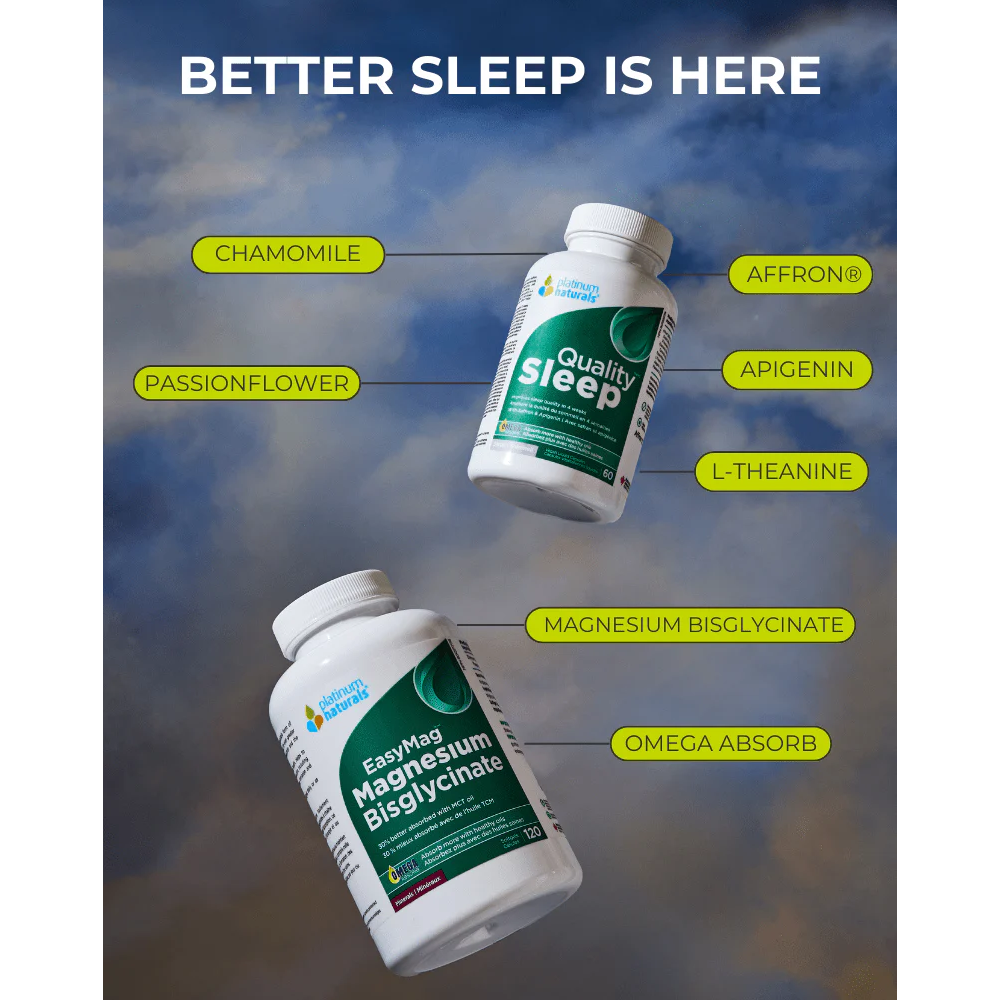 Introducing Quality Sleep™ – an innovative formula that combines the power of herbal medicine with modern science to deliver restful sleep. It combines Affron®, a well-researched and premium source of Saffron, clinically proven to improve sleep quality in 4 weeks, with key nutrients to help relieve restlessness and improves restorative sleep. Quality Sleep™ offers a natural solution to sleeplessness without the use of melatonin.